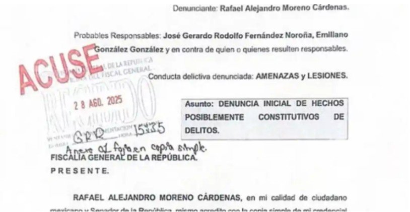 El presidente nacional del Partido Revolucionario Institucional (PRI), Alejandro Moreno Cárdenas, presentó una denuncia penal ante la Fiscalía General de la República (FGR) en contra de Gerardo Fernández Noroña, actual presidente de la Mesa Directiva del Senado.